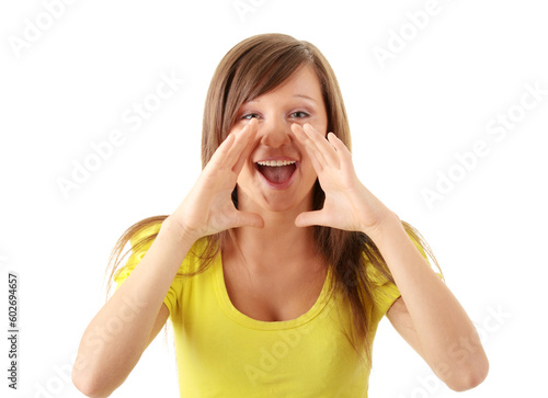 © Designpics, Fototapeta premium Attractive casual woman screaming (shouting) through hands isolated on white