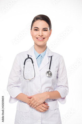 Fototapeta premium Attractive doctor in white coat and stethoscope smiling at camera isolated on white