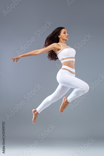 Fototapeta premium Attractive excited fitness girl, ballerina dancer in sportwear jumping of joy...