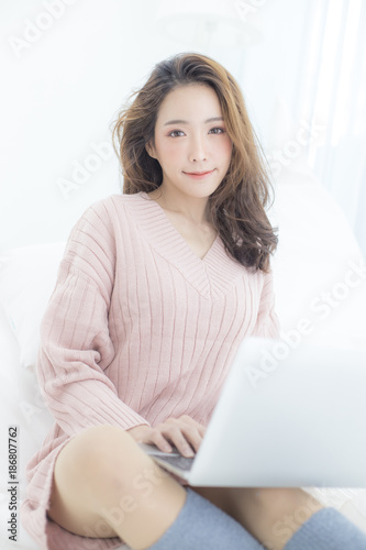 © Jestercine, Naklejka premium Attractive female using laptop at bedroom. People lifestyle concept.