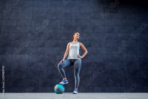 Fototapeta premium Attractive fit Caucasian brunette in sportswear holding foot on weight ball...