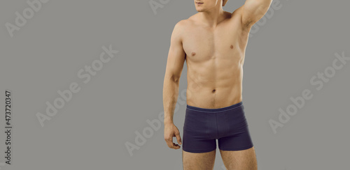 © Studio Romantic, Fototapeta premium Attractive, flirty and coquettish muscular man with perfect athletic body posing in underwear on background. Cropped image of man with naked torso straightening his hair near copy space. Banner.