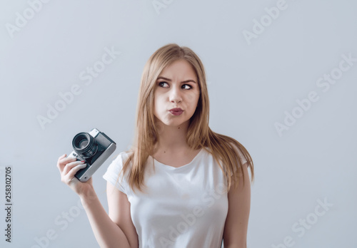 Fototapeta premium Attractive girl holding a vintage camera in her hands. Confusedly looks