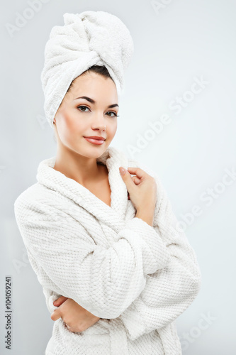 Obraz premium Attractive girl with dark hair wearing bath robe and towel