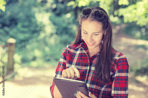 © pathdoc, Obraz premium attractive happy casual woman using pad mobile pc