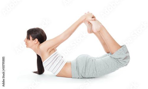 © Alen-D, Fototapeta premium Attractive healthy young woman stretching gym, isolated on white