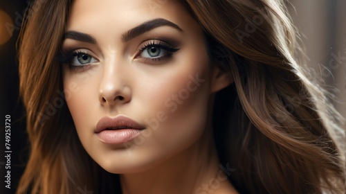 Fototapeta premium Attractive italian model woman with straight flying hair and light make up with long eye lashes from Generative AI
