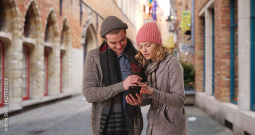 © Mark Adams, Fototapeta premium Attractive male and female using smartphone for directions on Belgian streets