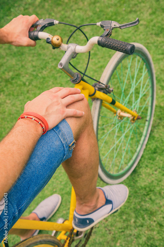 © Kitja, Obraz premium Attractive man sitting on old bicycle outdoors.