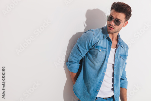 © Viorel Sima, Fototapeta premium Attractive man standing against the wall and looking at a side
