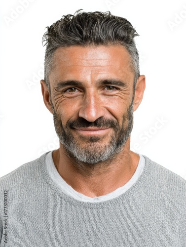 © Johannes, Fototapeta premium Attractive mid aged mature Brazilian man with a friendly demeanor, facing the camera, isolated on white background.