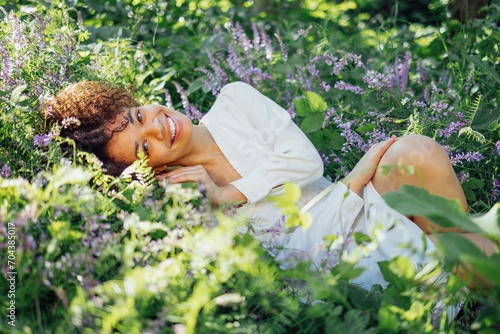Obraz premium Attractive mixed race girl in white elegant chiffon dress sits among blooming purple flower