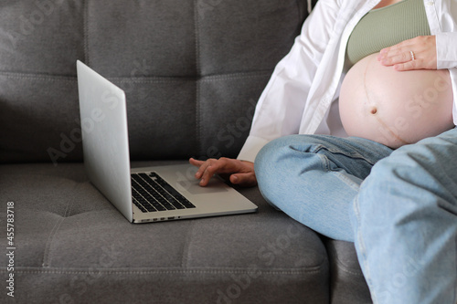 © Andriy Medvediuk, Naklejka premium Attractive pregnant young lady working remotely online from home. Close up woman hands on laptop with big belly advanced pregnancy