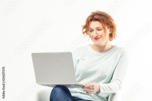 Fototapeta premium Attractive red haired mature smiling woman sitting in the chair with a laptop on her knees, working or watching something against white background