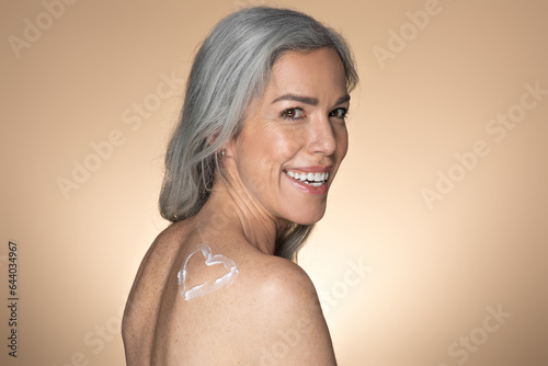 © Prostock-studio, Obraz premium Attractive senior woman with heart made of body cream on back standing half-turned and smiling, free space