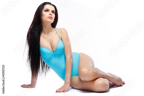 Obraz premium Attractive sexual brunette in a turquoise swimming suit