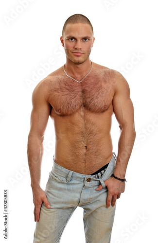 Fototapeta premium Attractive shirtless male in jeans, isolated on white