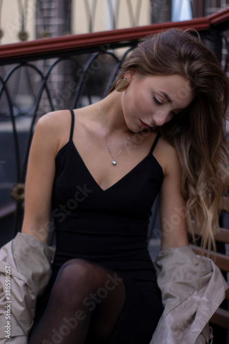 Fototapeta premium attractive slim young brunette in fashionable trench coat and black dress...