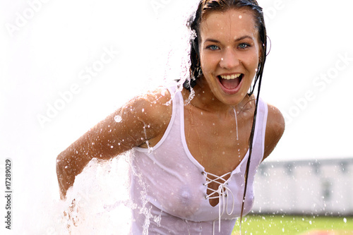 Fototapeta premium Attractive smiling girl bathing in city fountain
