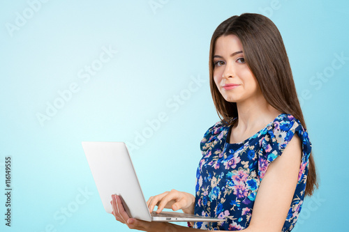 © fotofabrika, Naklejka premium Attractive smiling young woman holding laptop computer