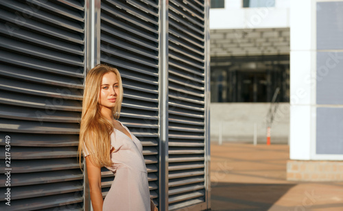 Fototapeta premium Attractive tanned model in fashionable outfit posing at the background of...