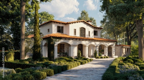 © PrismCraft, Fototapeta premium attractive view of Charming, Mediterranean-style villa with a stucco exterior.