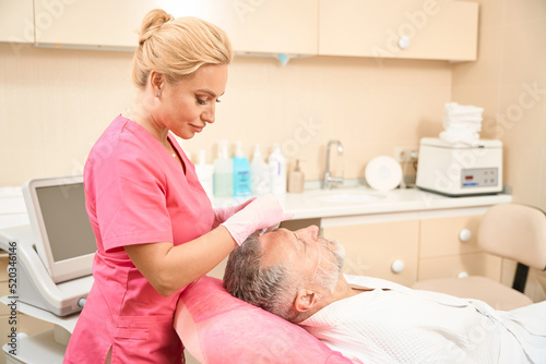 © Viacheslav Yakobchuk, Obraz premium Attractive woman beautician doing ultrasonic facelift to man in clinic