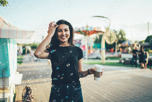 © BullRun, Fototapeta premium Attractive woman feeling happy emotions resting on vacation in amusement park, cheerful smiling hipster girl having fun with soap bubbles in air entertaining during summer vacation on city festival.