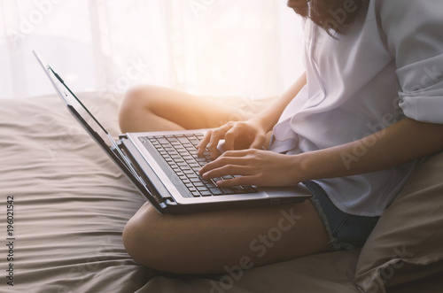 © thithawat, Naklejka premium attractive woman hands using laptop working typing keyboard on the bed in sleeping room at morning after wake up.