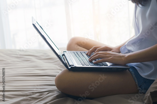 © thithawat, Fototapeta premium attractive woman hands using laptop working typing keyboard on the bed in sleeping room at morning after wake up.