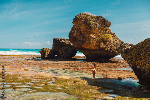 © artifirsov, Fototapeta premium Attractive woman in bikini posing at ocean beach near rocks