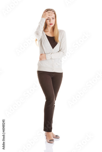 Fototapeta premium Attractive woman is touching her forehead and stomach.