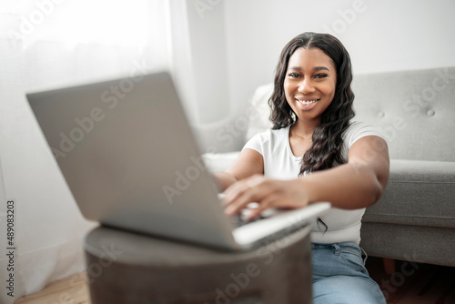 © Louis-Paul Photo, Naklejka premium Attractive young African woman working on laptop while sitting on the couch at home