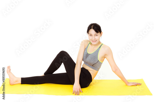 © thithawat, Fototapeta premium attractive young asian woman doing yoga pose on white background in white room studio.