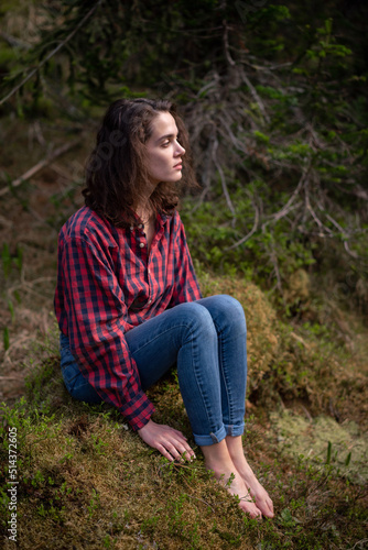 © horimono, Naklejka premium Attractive young girl in hipster clothes inforest on moss posing