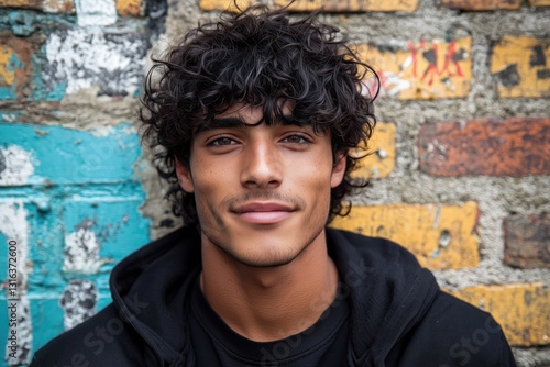Fototapeta premium Attractive Young Man Portrait: Smiling Model with Curly Hair, Urban Background