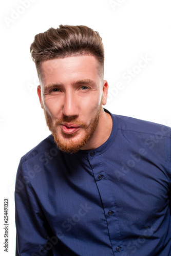 © nazarovsergey, Obraz premium Attractive young man wearing blue shirt, isolated over a white background.