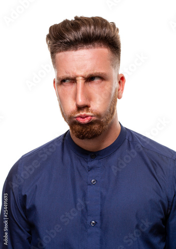 © nazarovsergey, Obraz premium Attractive young man wearing blue shirt, isolated over a white background.