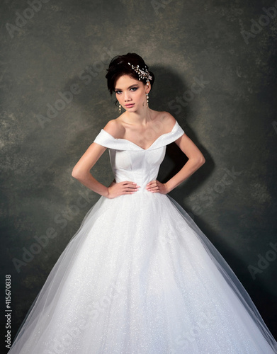 Fototapeta premium Attractive young model in a white dress with jewelry in her hair. Beautiful bride with wedding makeup and fashion hairstyle