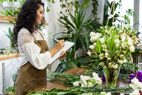 Obraz premium Attractive young woman florist is working in a flower shop.