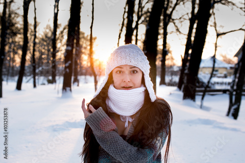 © muzhchil, Obraz premium attractive young woman (Girl) playing with snow in warm clothing smiling in the Park