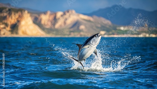 © Argiduna, Fototapeta premium atun saltando en el mar con la costa de fondo