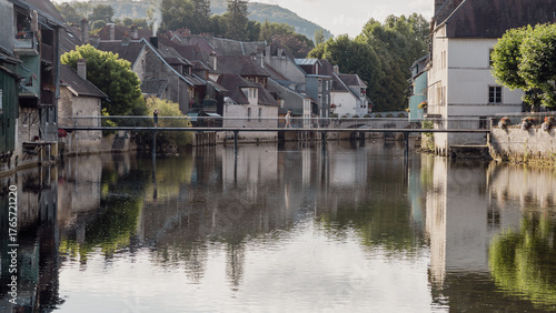 © jef 77, Obraz premium Au cœur de la vallée de la rivière la Loue dans le département du Doubs en France , la ville d' Ornans est un petit joyau aux maisons pittoresques suspendues au-dessus de la rivière