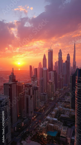 © Augusto, Fototapeta premium Aube Éblouissante sur la Silhouette Moderne de la Ville