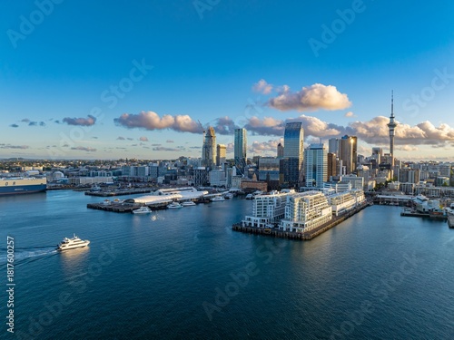 Naklejka premium Auckland, New Zealand: A ferry transports people across the harbor, with the city skyline and Sky Tower in the background. The city is a hub for business and tourism.