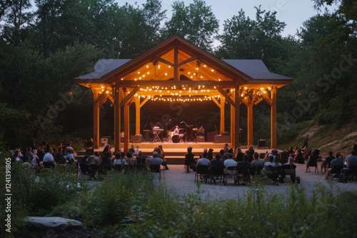 © Michael, Obraz premium Audience enjoying live music performed on an outdoor stage under string lights in a park