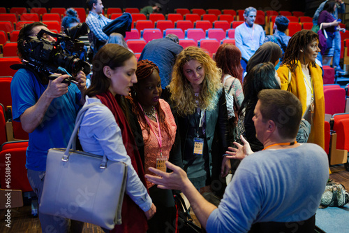 © KOTO, Fototapeta premium Audience talking to speakers in wheelchairs on stage