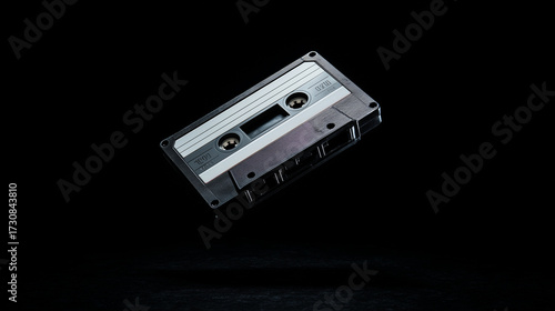 Obraz premium Audio cassette levitating with reflected light on a dark background, symbolizing nostalgic music and retro technology