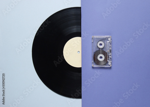 Obraz premium Audio cassette, vinyl record on blue gray background. Retro style. Top view