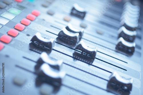 Fototapeta premium Audio mixer control panel with sliders in blur